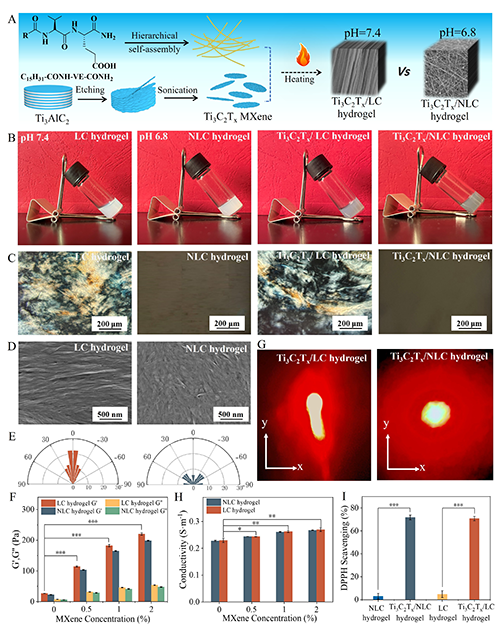 圖2. LC、NLC、Ti3C2Tx/NLC和Ti3C2Tx/LC水凝膠的表征。(A)水凝膠的構建示意圖。(B, C) LC和NLC水凝膠與Ti3C2Tx MXene混合前后的照片和POM圖像。(D, E)自組裝肽納米纖維SEM圖像和取向分布統計分析。(F)添加Ti3C2Tx MXene前后LC和NLC水凝膠的儲存模量G’和損耗模量G”。(G-I)不同水凝膠的激光散射圖像、電導率和自由基清除能力分析。
