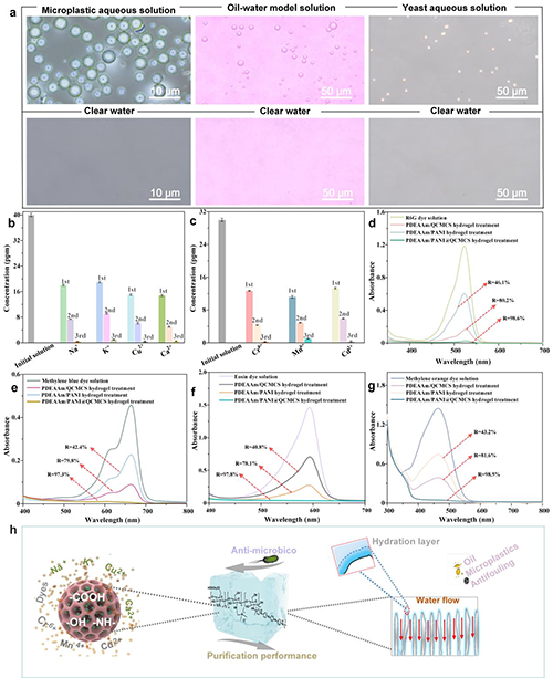 圖3 PDEAAm/PANI@QCMCS水凝膠的污水凈化性能評估:(a) 微塑料、油污及酵母菌懸液經PDEAAm/PANI@QCMCS水凝膠處理前后的顯微圖像對比;(b) 不同離子污染水體經水凝膠處理前后的濃度變化;(c) 多種重金屬離子溶液經三次循環處理后的濃度變化;(d-g)典型染料溶液(羅丹明6G、亞甲基藍、曙紅Y、甲基橙)處理前后的濃度變化;(h) PDEAAm/PANI@QCMCS水凝膠的凈化機理示意圖。