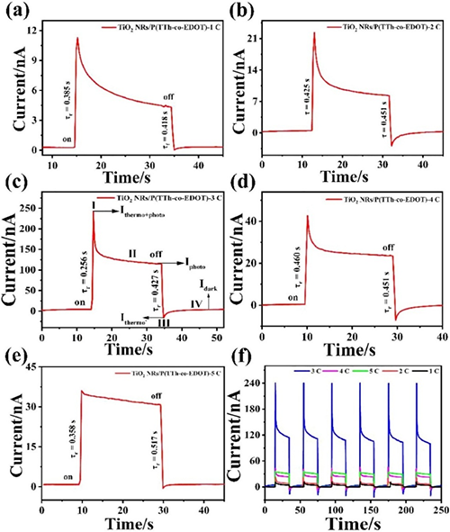 圖4. TiO2 NRs/P(TTh-co-EDOT) 共聚物異質結在不同沉積周期下的I-T曲線。(a)1C;(b)2 C;(c)3C;(d)4C;(e)5C;(f)不同沉積周期下的I-T曲線。