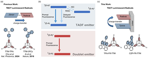 圖1:典型TBCT與TSCT自由基構(gòu)型圖解及代表分子,以及TADF材料與雙線態(tài)材料發(fā)光機(jī)理圖解。