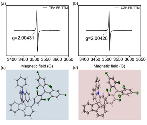 圖2:TPA-FR-TTM和CZP-FR-TTM的電子順磁共振表征及單晶分子結(jié)構(gòu)。