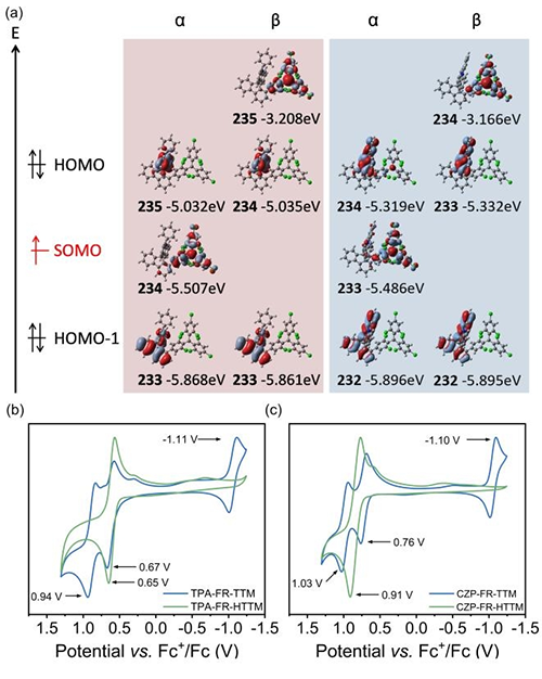 圖5:TPA-FR-TTM和CZP-FR-TTM的前線分子軌道分析與循環(huán)伏安測試結(jié)果。