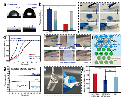 材料的創(chuàng)新性之一在于結(jié)合了仿生汗液管理:AT-TPU層經(jīng)親水改性后接觸角為84.7°(3秒內(nèi)浸潤),P-TPU層形成疏水表面(接觸角135°)。當(dāng)疏水側(cè)接觸皮膚時,3-6μm大孔徑與0.1-2μm小孔徑形成的梯度結(jié)構(gòu)以及梯度潤濕性產(chǎn)生毛細(xì)壓差,驅(qū)動液體在2秒內(nèi)穿透膜層(圖4c左)。蒸發(fā)速率達(dá)1.5g/h,是PET紡織品的3.2倍(圖4d)。