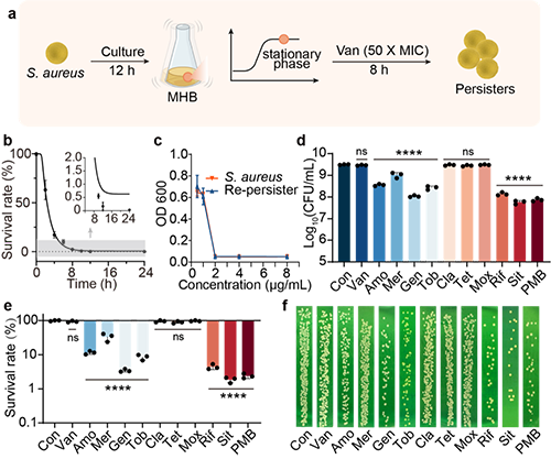 研究團隊首先建立了以萬古霉素誘導形成的持留菌模型。結果顯示,該模型呈現出持留菌典型的雙相殺傷曲線,并在復蘇前后保持一致的最小抑菌濃度,驗證了持留菌的成功構建。在隨后的抗生素篩選實驗中,研究團隊系統評估了11種機制各異的抗生素對浮游持留菌的清除效果,結果表明Sit、Rif和多粘菌素B(PMB)對浮游型持留菌的清除效果最佳(圖2)。