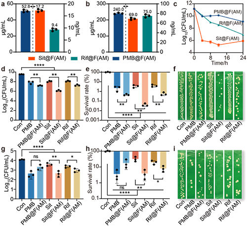 研究團隊將 Sit、Rif 和 PMB 分別負載于 F(AM) 納米平臺,制備 Sit@F(AM)、Rif@F(AM) 和 PMB@F(AM) 納米顆粒。所得納米粒子在 pH 7.4 及pH 5.5下均保持結構穩定與緩釋行為(圖4)。在浮游型持留菌中,Rif@F(AM) 與 Sit@F(AM) 的殺滅率分別達 99.4% 和 99.96%,均優于游離藥物;PMB@F(AM) 亦略有提升。在胞內持留菌清除評價中,Rif@F(AM) 與 Sit@F(AM) 的殺菌率仍保持在92%和96%,顯著優于游離藥物,而 PMB@F(AM) 未顯優勢(圖5)。綜上,Sit@F(AM) 與 Rif@F(AM) 在兩種模型中均展現出卓越的持留菌清除能力,驗證了 F(AM) 作為精準抗菌納米平臺的應用潛力。