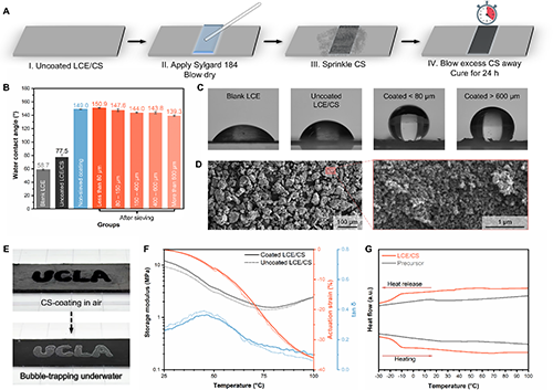 具體而言,研究團隊受兩棲哺乳動物利用空氣水膜實現熱絕緣的自然現象啟發,在液晶彈性體(liquid crystal elastomer, LCE)驅動器表面引入了超疏水蠟燭煙灰(candle soot)涂層,從而穩定捕獲一層空氣膜。這一空氣膜被證明顯著地提升了水下的熱絕緣性能,增強了內部溫度梯度,計算得到的機械輸出功提高了282倍。