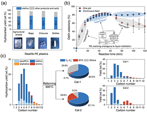 研究團隊進一步考察了該自限域裂解工藝的實際應用潛力。針對農業地膜、包裝袋等多種來源的廢棄聚乙烯,該技術均表現出較高的烯烴收率。由于自限域效應有效抑制副反應,該工藝特別適用于工業化連續進料工況,可長期穩定維持高烯烴選擇性。此外,將自限域裂解與催化重整工藝集成,可實現產物分布的靈活調控,定向生成C?–C?輕烯烴和BTX芳烴,展現出良好的技術適應性與集成能力。