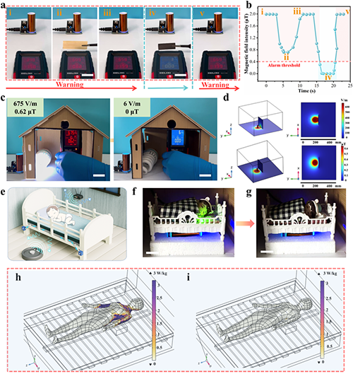 此外,通過在嬰兒床下方安裝特斯拉線圈來構建室內家庭場景,以模擬電動嬰兒床可能產生的電磁輻射暴露情況。當線圈激活時,放置在嬰兒床表面的白熾燈泡會亮起。當將復合材料用作嬰兒床面板上的屏蔽層時,后續(xù)線圈的激發(fā)無法觸發(fā)白熾燈泡的亮起,這表明該復合材料在輻射防護方面具有極好的潛力,非常適合用于可穿戴電子設備和智能家居系統(tǒng)等新興應用中。