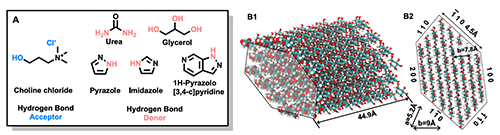 圖1. (A)深共晶溶劑組成:膽堿氯化物為氫鍵受體(hydrogenbondacceptors,HBA);尿素、甘油、吡唑、咪唑和1H-吡唑[3,4-c]吡啶等作為氫鍵供體(HBD)。(B1)由多個鏈組成的纖維素Iβ晶體的原子模型。(B2)帶標記晶格參數和層間距的纖維素Iβ的晶體晶格結構。