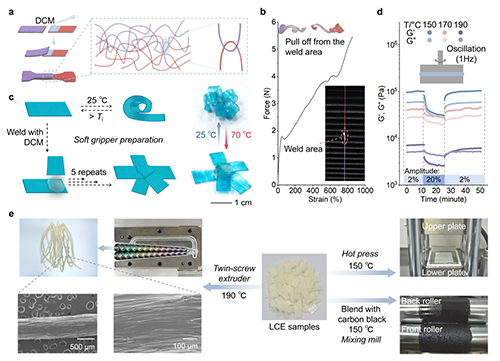 在加工性能方面,作者分別研究了溶劑加工和熔融加工兩種方法(圖3)。對于溶劑加工,作者通過滴加二氯甲烷(DCM)溶劑,使其滲透到材料中,增強分子鏈的運動能力,隨后在外力作用下將兩片材料焊接在一起。焊接后的樣品展現出1.82 MPa的粘接強度。該粘接工藝可在室溫下完成,無需額外的粘合劑,從而便于制造復雜結構的驅動器。作為概念驗證,作者將五個可逆彎曲和伸直的LLCE-0.5-1薄膜粘接成五指形態。對于熔融加工,作者使用雙螺桿擠出機成功擠出連續纖維。此外,作者還分別使用開煉機和熱壓機對材料進行加工。開煉機用于摻入炭黑以制備復合材料,而熱壓機用來將剪成碎片的材料重新熱壓成片材。這些結果表明,LLCE-0.5-1可以像傳統熱塑性塑料一樣進行加工。