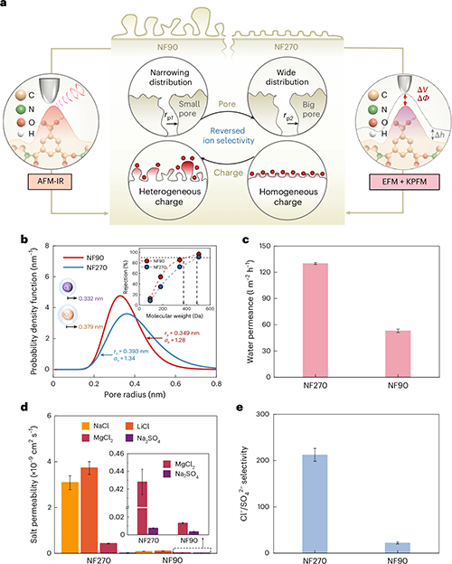 20世紀(jì)80年代末,FilmTec公司成功開(kāi)發(fā)了商品化聚酰胺納濾膜,推動(dòng)了納濾技術(shù)走向市場(chǎng)化應(yīng)用,在過(guò)去的40年里,NF90和NF270膜產(chǎn)品作為主流的納濾膜產(chǎn)品,在水處理領(lǐng)域占據(jù)了主導(dǎo)地位。在測(cè)試兩款商業(yè)納濾膜離子選擇性的實(shí)驗(yàn)中,研究團(tuán)隊(duì)意外發(fā)現(xiàn)了“孔徑分布窄,而選擇性低”的“反常識(shí)”現(xiàn)象。從數(shù)據(jù)上看,NF90膜的孔徑(rp=0.349 nm)比NF270膜(rp=0.393 nm)小,孔徑分布也更窄(NF90膜的幾何偏差σp=1.28,而NF270膜為1.34)。NF90膜的孔半徑介于Cl-離子的水化半徑(0.332 nm)和SO42-離子的水化半徑(0.379 nm)之間(圖1a,b)。按照“孔徑?jīng)Q定論”,NF90 膜的選擇性應(yīng)該更好才對(duì)。可實(shí)際測(cè)試中,NF270 膜的Cl-/SO42-選擇性,卻比NF90膜高出了近10倍(圖1c-e)!這一現(xiàn)象直接挑戰(zhàn)了“孔徑分布決定選擇性”的傳統(tǒng)認(rèn)知,也暗示存在尚未被發(fā)掘的核心調(diào)控因素。為何疏松的NF270膜能有如此之高的離子選擇性?難道是“電荷”在搞鬼?可檢測(cè)發(fā)現(xiàn),兩種膜的宏觀表面電荷強(qiáng)度(Zeta電位)差不多。這時(shí)候,研究團(tuán)隊(duì)提出了一個(gè)大膽猜想:會(huì)不會(huì)是納米尺度下的電荷分布均勻性,才是真正的“關(guān)鍵因素”?