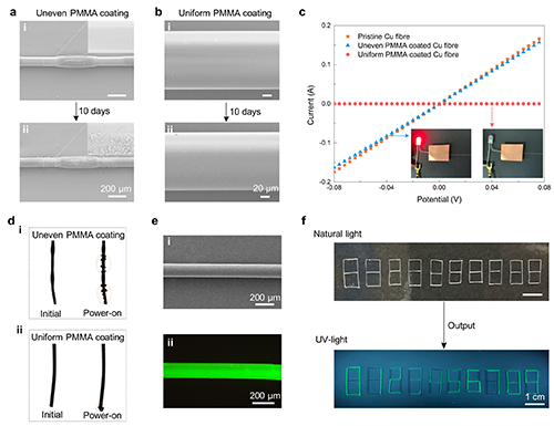基于該纖維涂覆方法的普適性,作者選擇銅纖維為涂覆基材來探究均勻涂覆的必要性。研究發現,銅纖維暴露在空氣中十天即會被氧化,發生Plateau–Rayleigh不穩定得到的PMMA涂層銅纖維其表面的氧化仍然存在,而由納米粒子與聚合物配體的快速界面組裝制備的均勻PMMA涂層則能夠防止銅纖維表面被氧化。并且,不均勻PMMA涂層的纖維接通電路會發生漏電,在稀硫酸溶液中進行析氫反應時會被電解,而均勻的PMMA涂層能夠有效的用作電子封裝,以上這些結果均證明了纖維表面均勻涂覆的必要性。此外,作者選擇性引入量子點至聚合物涂層中,通過不同組分涂層纖維的編織設計,得到了具有顯示及防偽功能的纖維器件。