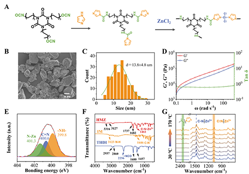 該工作以六亞甲基二異氰酸酯三聚體(Tri-HDI)與咪唑(IM)高效反應(yīng)為基礎(chǔ),合成三官能團(tuán)咪唑封端中間體,并引入ZnCl?構(gòu)筑由咪唑脲鍵與Zn2?配位鍵協(xié)同穩(wěn)定的三維交聯(lián)網(wǎng)絡(luò),最終獲得粉末態(tài)潛伏型促進(jìn)劑HMZ。通過雙動(dòng)態(tài)鍵協(xié)同作用,不僅實(shí)現(xiàn)了對(duì)高活性咪唑的穩(wěn)定封裝,更賦予體系精準(zhǔn)的溫度響應(yīng)特性,為單組分體系的長效儲(chǔ)存與快速激活提供了全新解決方案。系統(tǒng)表征結(jié)果(圖2)顯示,HMZ呈不規(guī)則的顆粒形貌;流變、FTIR與XPS證實(shí)其交聯(lián)的特點(diǎn),以及脲鍵(C=O, N–H)與Zn–N配位鍵的存在;變溫紅外分析表明,升溫過程中咪唑脲鍵逐步解離,展現(xiàn)出良好的熱響應(yīng)動(dòng)態(tài)特征,為固化反應(yīng)的精確控制奠定基礎(chǔ)。