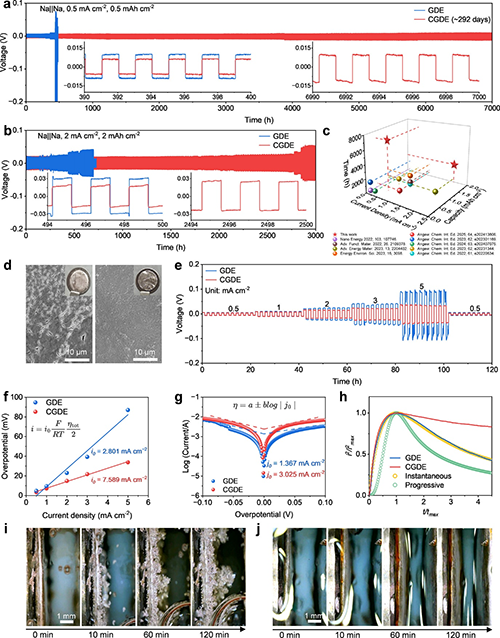 圖3. 鈉金屬負(fù)極的長期循環(huán)穩(wěn)定性。(a)在0.5mA/cm2、0.5mAh/cm2下Na||Na對(duì)稱電池的長期循環(huán)(插圖:390-400和6990-7000小時(shí)的放大圖)以及(b)在2mA/cm2、2mAh/cm2下的循環(huán)(插圖:494-500和2494-2500小時(shí)的放大圖)。(c)本工作與先前報(bào)道的Na||Na對(duì)稱電池性能對(duì)比。(d)循環(huán)50圈后GDE和CGDE中Na負(fù)極的SEM圖像和光學(xué)數(shù)碼照片(插圖)。(e)GDE和CGDE從0.5到5mA/cm2電流密度下的極化電壓變化曲線。(f)GDE和CGDE從0.5到5mA/cm2電流密度下計(jì)算出的交換電流密度。(g)GDE和CGDE的Tafel曲線。(h)GDE和CGDE(在-150mV vs Na+/Na下獲得)的Na||Na對(duì)稱電池的i2/i?2與t/t?的無量綱曲線,與理論成核模型進(jìn)行比較。原位光學(xué)顯微鏡圖像顯示在(i)GDE和(j)CGDE中2mA/cm2下Na負(fù)極上的鈉沉積過程。
