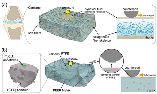 聚醚醚酮(PEEK)廣泛應(yīng)用于輕量化結(jié)構(gòu),但純PEEK自身潤(rùn)滑性差制約了其進(jìn)一步發(fā)展,而傳統(tǒng)添加聚四氟乙烯(PTFE)潤(rùn)滑劑的方法潤(rùn)滑效率低下,且過(guò)多的PTFE會(huì)導(dǎo)致材料力學(xué)性能的顯著衰退。因此,如何實(shí)現(xiàn)潤(rùn)滑相的可控分布與定向遷移,從而在摩擦界面構(gòu)建穩(wěn)定、有序的潤(rùn)滑層,已成為該領(lǐng)域面臨的重大挑戰(zhàn)。受人體軟骨“在應(yīng)力控制下釋放滑液”機(jī)制的啟發(fā),巧妙地將二維材料MXene(Ti?C?T?)作為“調(diào)控器”,與PTFE潤(rùn)滑劑協(xié)同作用,成功制備出新一代PEEK基復(fù)合材料。