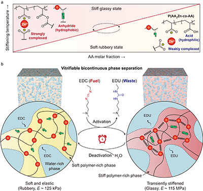 近期,團隊研究發現,現有非平衡材料大都基于小分子組裝或均一網絡結構,其無法劇烈硬化的根本原因在于缺乏有效的玻璃化轉變機制。他們提出,將非平衡化學與玻璃化相分離相結合,有望實現非平衡材料的劇烈可逆硬化。為此,他們合成了丙烯酸鋅-丙烯酸(PAA2Zn-co-AA)共聚物水凝膠。其中,聚丙烯酸鋅為典型LCST熱致硬化高分子,在硬化溫度以上可發生橡膠態-玻璃態相分離轉變。丙烯酸則扮演雙重角色:一方面可在室溫附近調控該水凝膠的硬化溫度,另一方面可被化學燃料EDC催化脫水形成酸酐,而酸酐又隨時間自發水解變回丙烯酸。這一EDC燃料驅動的非平衡轉化可促使共聚物水凝膠硬化溫度在室溫附近切換,從而誘導材料瞬態硬化。研究發現,在化學燃料刺激下,該水凝膠從柔軟的橡膠態(~125 kPa)可逆轉變為堅硬的玻璃態(~115 MPa),模量提升高達920。這一模量不僅創下了人造非平衡硬化材料的模量紀錄,也是首次將非平衡材料的硬化態推進到了玻璃態。此外,該水凝膠還展現出可編程的壽命和優異的循環性能。