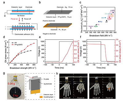 在實際應用方面,該材料展現出雙重潛力;PP-g-DAP2薄膜制備的靜電吸附離合器實現了7.61 N/cm2的剪切應力,比原始PP提升58.3%,能夠成功提起2公斤重物及驅動機械手完成抓物體操作。