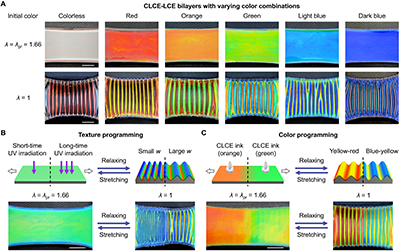 針對上述問題,斯坦福大學趙芮可教授團隊報道了一種膽甾相液晶彈性體雙層體系(Cholesteric liquid crystal elastomer-liquid crystal elastomer,CLCE-LCE),通過應變失配誘導的表面失穩行為實現了紋理與結構色的同步可逆調控。通過系統調控CLCE層厚度、基底預拉伸比與雙層模量比等關鍵參數,實現了對褶皺形貌與顏色組合的按需設計。進一步結合空間選擇性光固化與化學圖案化策略,在單一材料中實現了空間可編程的紋理變化與顏色響應。該雙層體系在動態熱調節與多態信息編碼等功能應用中展現出獨特優勢,為開發表面形貌與光學特性可編程的多功能材料提供了全新平臺。
