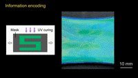 利用具有特定圖案的光掩膜進行空間選擇性光固化,可精確調控CLCE表面不同區域的模量,從而實現可視化信息編碼。例如,使用“S”形掩膜對綠色雙層CLCE-LCE進行局部光固化(圖5A)。應力釋放后,固化的“S”區域呈現藍色褶皺,而未固化區域保持平整并變為橙色,從而使“S”圖案顯現,再次拉伸后圖案可逆消失(圖5B)。通過多步選擇性光固化在不同應力條件下定義圖案,還可實現信息的按序顯示(圖5C,D;視頻4)。
