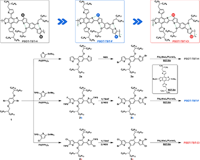 本研究設計合成了系列D–π–A型聚合物給體PBDT-TBT-X(X = H、F、Cl),其A單元結構簡化并引入了不同非共價“構象鎖”,系統研究了非共價“構象鎖”類型與強度對主鏈構象、光電性質、預聚集行為以及電荷傳輸性質中的調控機制。