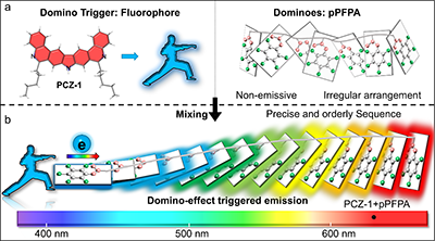 圖2. 多米諾效應觸發發射。(a-b)多米諾骨牌觸發器(PCZ-1)、多米諾骨牌(pPFPA)和重復單元上的紅移發射示意圖。