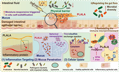 潰瘍性結腸炎(UC)作為一種難治性炎癥性腸病,其特征包括腸道屏障破壞、微生物群失調和持續黏膜炎癥。當前UC治療面臨多重挑戰:傳統納米藥物遞送系統存在靶向性不足、黏液穿透能力弱、易被溶酶體降解等問題;而現有水凝膠屏障材料因其靜態交聯網絡結構,在腸道復雜環境中易受腸液沖刷和腸道蠕動影響而失效,難以實現持久的黏膜保護功能。