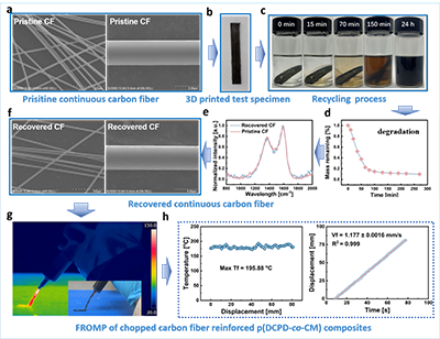 在回收過程中,c-CFRPs 復合材料經(jīng)鹽酸 / 甲苯溶液處理后,樹脂基體降解為可溶性低聚物。這些低聚物保留了環(huán)戊烯官能團,能夠與 DCPD 樹脂重新混合后進行前端聚合,制備的再生材料固化度超過 95%,玻璃化轉(zhuǎn)變溫度與原始材料相當(約 120 °C)。回收碳纖維保持了完整的連續(xù)性和光滑表面形態(tài),XRD 和拉曼光譜證實其結構未受降解過程影響。將回收碳纖維重新用于 3D 打印,制備的復合材料拉伸性能與原始碳纖維復合材料基本一致,實現(xiàn)了碳纖維的多次無損回收。