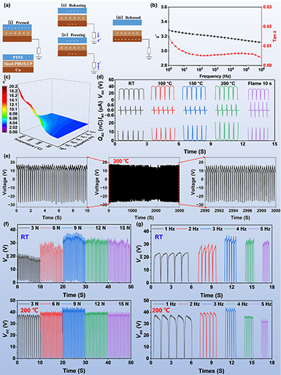基于該復合材料制備的TENG展現出卓越的極端環境適應性(圖3),其在 200°C 高溫下開路電壓達 42 V,較室溫提升 26.5%,且在火焰燃燒 10 s 后仍能保持近 100% 的電輸出性能,同時電輸出性能隨溫度升高線性增加。這種高溫增強特性源于溫度升高加速電子轉移、促進偶極子取向極化,以及改性后復合材料界面相容性提升帶來的穩定介電性能,同時 PBO/LCP 復合材料的高剛性結構與粗糙表面也進一步優化了摩擦電輸出效率,為消防、太空等極端環境應用提供自供電解決方案。