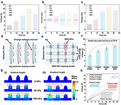 摩擦電傳感器的最大表面電荷密度(σ)與摩擦層相對介電常數(εr)正相關、與有效介電厚度(d)負相關(σ∝εr/d),因此提升εr或減小d是優化摩擦電傳感器性能的核心路徑。如圖2所示,利用多巴胺(PDA)的自聚合特性與弱還原性,開發BST@PDA@Ag復合納米粒子(BPA NPs),基于PDA分子鏈空間位阻效應抑制納米填料團聚,依托高介電BST提升復合膜εr,利用金屬Ag粒子減小復合膜有效介電厚度,實現電荷密度多維度增益。同時,設計徑向排列的梯度高度微錐陣列,其力學響應呈現“逐級承載”特性,不同高度微錐隨外界壓力增大依次接觸并形變;均勻高度微錐陣列則表現為“同步受壓”模式,所有微錐同步形變。這種力學行為差異通過強化應力集中效應、拓展有效形變壓力區間,實現傳感靈敏度的顯著提升與傳感范圍的大幅拓展。