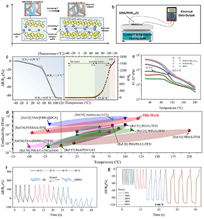 更為獨特的是其溫度響應行為(圖4)。當溫度超過約53 °C的閾值時,SEBS中的聚苯乙烯硬段鏈段運動能力增強,如同“打開閥門”,釋放出原本被限域的鋰離子,導致電導率急劇上升。在120 °C時,電導率提升高達1600倍。該材料在-45 °C至120 °C的超寬溫度范圍內均能保持高電導率(>10-3 S m-1),徹底突破了傳統水凝膠和離子凝膠的溫度使用極限。