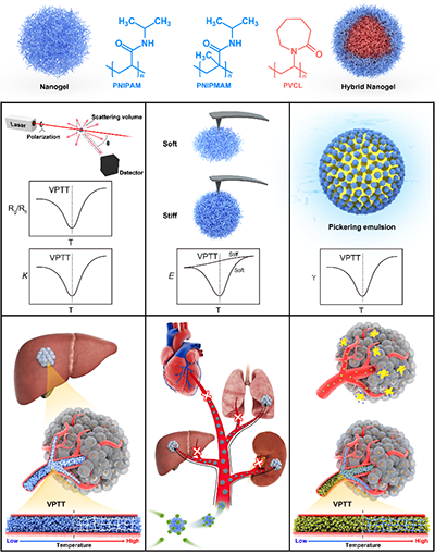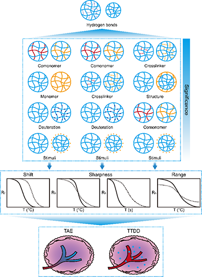 圖1. 納米凝膠的體積相變行為在經導管動脈栓塞術和腫瘤靶向藥物遞送等定制化生物醫學應用中的合理設計。