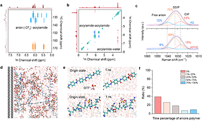 該研究報道了一種具有正相對陰離子親和力的親陰離子聚合物電解質。通過引入弱吸附陽離子的聚合物主鏈和強吸附陰離子的另一條聚合物鏈,削弱了Zn2?的陽離子-偶極配位作用,從而促進鹽的解離并限制陰離子的遷移。該聚合物電解質設計理念通過使用聚丙烯酰胺和芳綸納米纖維得以驗證。制備的親陰離子聚合物水凝膠電解質(APHE)有效抑制了析氫反應(HER),形成了薄且強附著性富無機物固態電解質界面(SEI)。該親陰離子聚合物電解質還展現出高Zn2+遷移數(0.71),使得Zn0.25V2O5||Zn(30 μm)軟包電池(4.9 mAh cm-2)在超過270次循環后仍能實現高度可逆性。