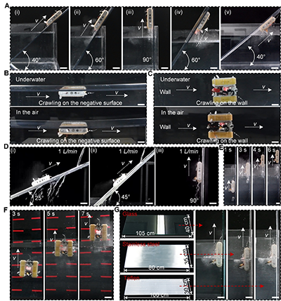 利用所提出的HMSAMSs的耐干、濕特性,以及機器人履帶優異的抗剝離性和接觸適應性,該團隊構建了兩棲跨介質爬壁機器人(圖4A),其主要由多個電子控制設備(電子調速器、接收器/發射器和控制手柄)、負壓吸附系統(葉輪和防水電機)以及各種3D打印部件組成。其中,負壓吸附系統安裝在由3D打印部件構建的機器人身體中央,它通過動態調節電機速度,為機器人履帶提供按需預壓力;簡單的電子控制設備使跨介質爬壁機器人能夠實現無繩系運動(例如直線運動和轉彎)。在機器人履帶上的耐干、濕HMSAMSs輔助下,所提出的跨介質爬壁機器人能夠在干燥環境(圖4B)和水下(圖4C)的垂直表面上穩健爬行,并且能夠平穩地穿越水-氣界面(圖4D)。