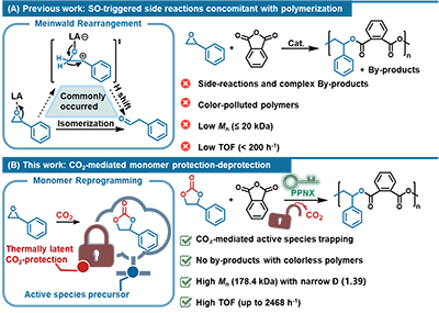 近日,中國科學院長春應化所王獻紅研究員課題組提出了一種二氧化碳介導的單體保護-脫保護策略。該策略通過引入CO2將SO轉換為結構穩定的環狀碳酸酯單體——苯氧基碳酸酯(SC),從而有效地抑制了不良的副反應。在高溫熱刺激下,SC會發生原位脫羧,生成烷氧負活性種,該活性物種在生成的瞬間即可被鄰苯二甲酸酐(PA)快速捕獲并參與鏈增長反應,實現高效、可控的交替聚合反應。通過這種“先穩定、后激活、即時捕獲”的反應設計,該研究成功在聚合條件下,僅借助結構簡單的有機鹽催化體系,即可制備出分子量高達178.4 kDa的聚酯材料,同時保持較低的分子量分布(D = 1.39),從根本上打破了該類結構聚酯長期受限于低分子量的瓶頸。