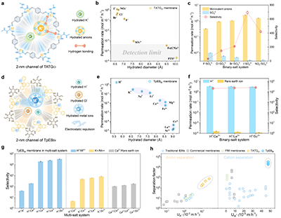 基于SMA策略制備的自支撐TATGCl膜富含氫鍵位點(diǎn),通過與不同水合陰離子之間氫鍵相互作用差異實(shí)現(xiàn)了高效的單多價(jià)陰離子分離。在單鹽體系中,一價(jià)陰離子與SO?2-的理想選擇性在~150至~1100之間。在雙鹽體系中,由于離子競爭效應(yīng),一價(jià)陰離子與SO?2-的選擇性下降至~30至~700。制備的TpEBBr膜通過孔道內(nèi)的正電荷與不同陽離子之間靜電相互作用差異實(shí)現(xiàn)了單多價(jià)陽離子的高效分離。在單鹽體系中,陽離子滲透速率順序?yàn)椋?/span>H? > 堿金屬離子(K?、Na?、Li?)> 堿土金屬離子(Ca2+、Mg2+、Fe2+)>> 稀土金屬離子(Ce3+、La3+、Sc3+)。其對(duì)H?/堿金屬離子選擇性約為10,H?/堿土金屬離子選擇性達(dá)到102,而H?/稀土金屬離子選擇性在104至105之間。在雙鹽及多鹽體系中,TpEBBr膜對(duì)H?/稀土金屬離子的選擇性仍能維持在2×104。相比于傳統(tǒng)離子交換膜、自聚微孔聚合物膜及商業(yè)膜,制備的TATGCl和TpEBBr COF膜同時(shí)實(shí)現(xiàn)了高離子滲透性和高選擇性,打破了傳統(tǒng)離子膜選擇性和通量之間的相互制約,展示了其在高鹽廢水處理和稀土金屬離子回收應(yīng)用中的巨大潛力。