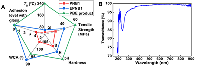 這一主鏈編輯策略通過剛性橋環結構與極性含氧官能團的雙重引入,實現了環烯烴聚合物多項核心性能的協同提升:(1)剛性橋環結構的構建使聚合物主鏈旋轉受限,產物玻璃化轉變溫度大幅提升至 233℃,遠高于商業降冰片烯基環烯烴聚合物 Zeonex,耐熱性實現質的飛躍;(2)力學性能顯著增強,硬度也得到大幅提升;(3)極性含氧基團的引入,讓原本為碳氫鏈結構的降冰片烯聚合物親水性大幅改善,在玻璃基材上的附著力達到0級;(4)產物在可見光區域保持良好的透光性,具有成為光學樹脂的潛力;(5)改性COPs產物的熱穩定性優異,5%質量損失溫度達381℃,擁有較寬的加工窗口,為應用奠定了基礎。