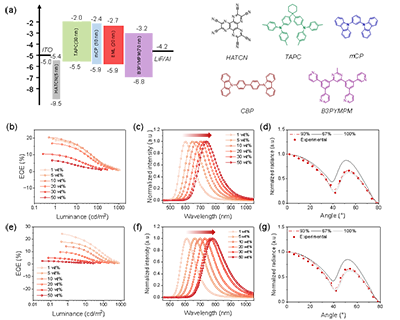 圖5:非摻雜NIR-OLED性能。非摻雜DTN器件在770 nm處EQE達(dá)2.9%,處于非摻雜近紅外TADF-OLED的領(lǐng)先水平。