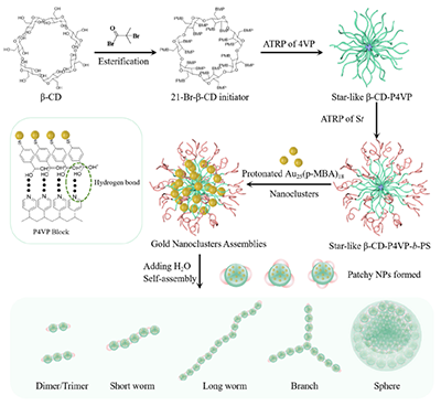 該研究通過原子轉移自由基聚合(ATRP)精心設計合成出一種星型兩嵌段共聚物——以β-環糊精為核心、聚(4-乙烯基吡啶)-b-聚苯乙烯(β-CD-g-P4VP-b-PS)為臂的單分子膠束。這種結構既能作為“納米反應器”,封裝預先合成的原子級精確[Au25(p-MBA)18]-團簇,又能通過氫鍵作用將其牢固固定在P4VP內核中,形成均一的二級結構組裝體。通過ATRP聚合可控合成不同尺寸單分子膠束,從而制備出不同尺寸的金納米團簇組裝體。這些組裝體呈近乎單分散的球形,并在外層包裹一層疏水性的PS鏈段。當加入不良溶劑水后,PS鏈因溶解性下降而發生局部塌縮,在納米球表面形成若干個“疏水補丁”(patchy nanoparticles),從而賦予其類似化學官能團的“反應活性”。