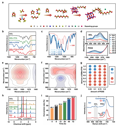 針對(duì)這一挑戰(zhàn),湖南大學(xué)材料科學(xué)與工程學(xué)院張世國(guó)教授團(tuán)隊(duì)提出了一種協(xié)同設(shè)計(jì)策略,將室溫自發(fā)原位凝膠技術(shù)與分子工程定制的不對(duì)稱紫精電致變色材料有機(jī)結(jié)合,成功構(gòu)建出一款兼具高安全性與優(yōu)異電化學(xué)性能的電致變色器件。在電解質(zhì)設(shè)計(jì)方面,研究團(tuán)隊(duì)采用雙三氟甲磺酰亞胺鋰與三氟乙酸組成的共引發(fā)體系,實(shí)現(xiàn)了1, 3-二氧戊環(huán)在室溫條件下的高效開環(huán)聚合,構(gòu)建了具有半互穿網(wǎng)絡(luò)結(jié)構(gòu)的聚(1, 3-二氧戊環(huán))-聚甲基丙烯酸甲酯離子凝膠電解質(zhì)。這一“原位固化”策略的核心優(yōu)勢(shì)在于:液態(tài)前驅(qū)體能夠在電極界面實(shí)現(xiàn)充分潤(rùn)濕,隨后在室溫下靜置(無需紫外光固化)即可自發(fā)轉(zhuǎn)化為凝膠態(tài),從而從根本上解決了傳統(tǒng)固態(tài)電解質(zhì)固-固接觸不良所導(dǎo)致的高界面阻抗問題,同時(shí)顯著簡(jiǎn)化了電致變色器件組裝工藝。