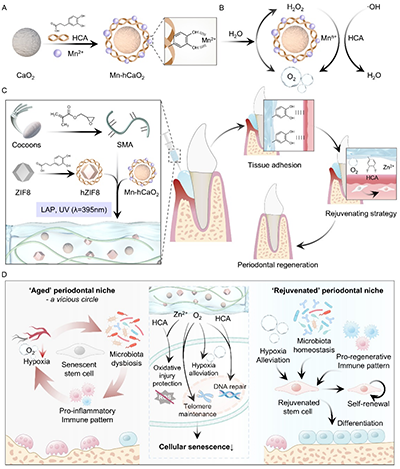 近日,四川大學華西口腔醫院王軍教授、西南交通大學醫學院謝超鳴教授與四川大學華西醫院國家老年疾病臨床研究中心劉瑾副教授合作團隊提出了一種多酚介導鋅氧協同水凝膠系統,利用錳-二氫咖啡酸(Mn-HCA)復合物催化作用減少氧化應激并糾正缺氧,Zn2?與HCA協同恢復菌群平衡、減輕炎癥。該水凝膠通過靶向衰老微環境,一方面使菌群穩態正常化并誘導促再生免疫表型,另一方面直接減輕干細胞DNA損傷和氧化應激,恢復細胞功能。該策略通過解決缺氧和鋅缺乏問題,為克服牙周再生障礙提供了新途徑。