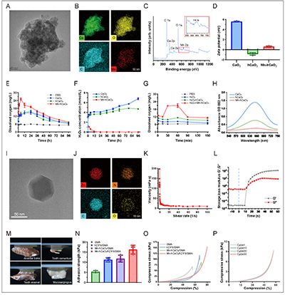 成功合成了Mn-HCA復合物修飾CaO2,Mn-hCaO2在2小時內達到20.72 mg/L的溶解氧峰值,并維持>10 mg/L長達60小時,同時H2O2濃度從12小時起趨近于零,證實其高效且安全的釋氧能力。Mn-hCaO2還表現出優異的過氧化氫和·OH清除活性。hZIF8呈現典型十二面體結構,多酚改善其分散性。復合水凝膠具有多孔結構、可注射性、快速光交聯特性,組織粘附強度及壓縮模量提升(圖2)。