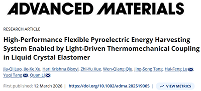 近日,東南大學李全院士團隊聯合杭州探氫氧智能科技有限公司創始人陸海峰研究員等,在智能柔性傳感材料領域取得重要進展,相關成果以“High-Performance Flexible Pyroelectric Energy Harvesting System Enabled by Light-Dri ven Thermomechanical Coupling in Liquid Crystal Elastomer”為題發表在化學材料頂級期刊《Advanced Materials》上(圖1,DOI: 10.1002/adma.202519065)。
