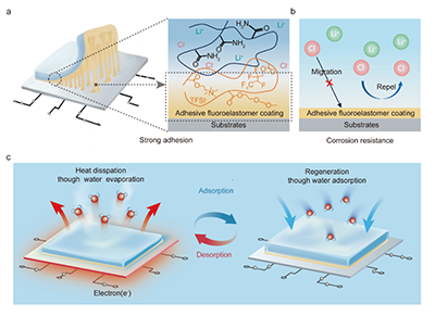 圖1 用于電子設備冷卻的氟彈性體界面改性吸濕水凝膠(FAHH)的示意圖。(a)左側為 FAHH 與基底之間強粘附性的示意圖。右側為 FAHH 的化學組成。(b)FAHH具有耐腐蝕性的示意圖,氟彈性體界面的疏水性和電負性排斥氯離子并防止水和鹽的泄漏。(c)FAHH用于電子設備冷卻的工作原理。在吸附期間,FAHH從周圍大氣中捕獲水分。當設備在較重負載下溫度升高,FAHH受熱解吸,從而散熱。