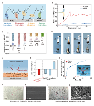 圖3 FAHH 的穩定冷卻界面。(a)FAHH 與各種基底(金屬、玻璃和塑料)的粘附機制示意圖。(b)通過 DFT 計算得出的含氟彈性體界面的功能基團與各種基底之間的結合能。(c)通過 180°剝離試驗測得的 FAHH 和 AHH 對鋁板的粘附強度,表明含氟彈性體界面的引入顯著增強了 PAM 吸濕水凝膠的粘附性。(d)FAHH 粘附于各種基底(鋁、銅、玻璃和塑料PET)的照片,其上持續承受 100 克的重量。(e)FAHH 的耐腐蝕機制。氯離子被帶負電的含氟彈性體界面排斥。(f)含氟彈性體界面以及構成含氟彈性體界面的三種均聚物(PHFBA、PDEGMA 和 P[MATAC][TFSI])的 Zeta 電位測試,表明含氟彈性體界面的帶負電性歸因于 PHFBA 和 PDEGMA。(g)FAHH 和 AHH 對氯離子的滲透性。插圖展示了測試裝置。(h–k)與 FAHH 和 AHH 接觸 60 天的循環試驗(每個循環 16 小時吸附和 8 小時解吸)后鋁板的數字照片和掃描電子顯微鏡圖像。
