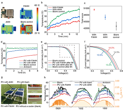 將FAHH應用于實際電子器件開發板與太陽能電池的散熱上。當將FAHH附著于開發板的鋁散熱片上重載運行時,該設備平均溫降17.8°C、最大溫降23.7°C,工作性能提升17.2%,而AHH平均溫降11.9℃,工作性能提升9.2%。當將FAHH用于太陽電池鋁背板時,8 h后電池平均溫降11.6°C、最大溫降17.4 °C,效率從13.2%提升至14.0%。戶外測試中,與通風不良條件相比,FAHH在12 h的白天內實現最大25.7 °C、平均12.1 °C溫降。相比之下,AHH實現最大10.4°C、平均3.8 °C溫降。