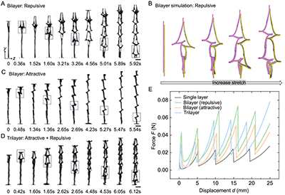 在單層結構中,盡管可存在序列突跳,但不同樣品之間的突跳順序存在明顯差異(圖2A-B)。這種隨機性源于制造過程中不可避免的微小缺陷,例如切口寬度不均或單元間隙差異。由于屈曲失穩(wěn)對缺陷高度敏感,不同樣品表現(xiàn)出不同的突跳路徑;但在同一結構中重復實驗,跳變順序保持一致,說明隨機性本質上由固定缺陷所決定。