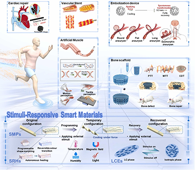圖1. 基于刺激響應性智能材料的生物醫(yī)學裝置在心臟修復、血管再通、仿生自反饋系統(tǒng)及骨組織再生等應用領(lǐng)域展現(xiàn)出廣闊的潛力