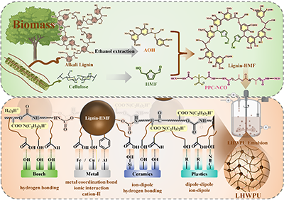 近日,華南理工大學(xué)劉偉峰和廣東工業(yè)大學(xué)邱學(xué)青團隊通過協(xié)同利用羥甲基糠醛與高酚羥基木質(zhì)素,構(gòu)建了一種新型生物基水性膠黏劑體系(LHWPU)。該膠黏劑表現(xiàn)出優(yōu)異的膠黏性能,在櫸木板、鐵板、銅板、鋁板及陶瓷等多種基材上的搭接剪切強度分別高達17.9 MPa、13.4 MPa、12.0 MPa、7.6 MPa 和 7.0 MPa,顯著優(yōu)于多數(shù)已報道的生物基膠黏劑體系,展現(xiàn)出優(yōu)異的通用粘接能力。其優(yōu)異的粘接性能可歸因于以下機制:1. 較低的體系黏度保證了良好的初始潤濕性能,使膠黏劑能夠在基材表面充分鋪展并促進界面吸附與分子擴散;2. 膠黏劑在木材等多孔基材中的滲透效應(yīng)形成穩(wěn)定的機械互鎖結(jié)構(gòu),從而增強界面結(jié)合強度;3. 熱壓固化過程中形成的交聯(lián)網(wǎng)絡(luò)顯著提高了膠層本體強度與界面穩(wěn)定性;4. 膠黏劑中的羥基、酯基等極性官能團能夠通過氫鍵、配位鍵等作用與木材、金屬、陶瓷等基材表面形成強界面相互作用;5. 木質(zhì)素誘導(dǎo)形成的納米微相分離結(jié)構(gòu)與氫鍵網(wǎng)絡(luò)協(xié)同作用,提高了能量耗散能力和剪切韌性。多重作用機制的協(xié)同效應(yīng)使LHWPU在不同基材上均表現(xiàn)出優(yōu)異而穩(wěn)定的膠黏性能。