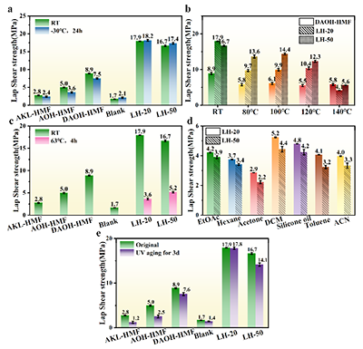 得益于高酚羥基低分子量木質(zhì)素、羥甲基糠醛與柔性異氰酸酯封端低聚物的協(xié)同應(yīng)用,LHWPU體系構(gòu)建了穩(wěn)定而致密的交聯(lián)網(wǎng)絡(luò)結(jié)構(gòu),從而賦予材料優(yōu)異的環(huán)境適應(yīng)性和粘接穩(wěn)定性。該膠黏劑在多種極端條件下仍能保持良好的粘接性能,包括低溫-30 °C、高溫140 °C、耐水(63 °C,4 h)、耐化學(xué)溶劑以及72 h紫外線輻照等環(huán)境條件。此外,多重相互作用構(gòu)建的網(wǎng)絡(luò)結(jié)構(gòu)不僅提高了膠層穩(wěn)定性和界面結(jié)合能力,還賦予材料良好的可重復(fù)使用與可回收利用特性,通過乙醇處理實現(xiàn)界面解離后再次粘接仍能保持較高的粘接強度。