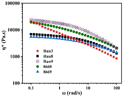 通過三檢測凝膠滲透色譜(triple-detection GPC)及流變測試等手段,研究團(tuán)隊進(jìn)一步驗證了長支鏈結(jié)構(gòu)的存在。結(jié)果表明,與傳統(tǒng)POE相比,長支鏈POE表現(xiàn)出更高的零剪切黏度、更明顯的剪切變稀行為以及更高的低頻儲能模量,這些特征均表明長支鏈結(jié)構(gòu)能夠顯著增強聚合物熔體的彈性和加工穩(wěn)定性。